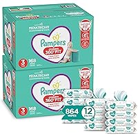 Pampers Baby Diapers and Wipes Starter Kit (2 Month Supply) - Pull On Cruisers 360° Fit Diapers with Stretchy Waistband Size 3 (2 x 168 Count) with Sensitive Baby Wipes, 12X Pop-Top Packs, 864 Count